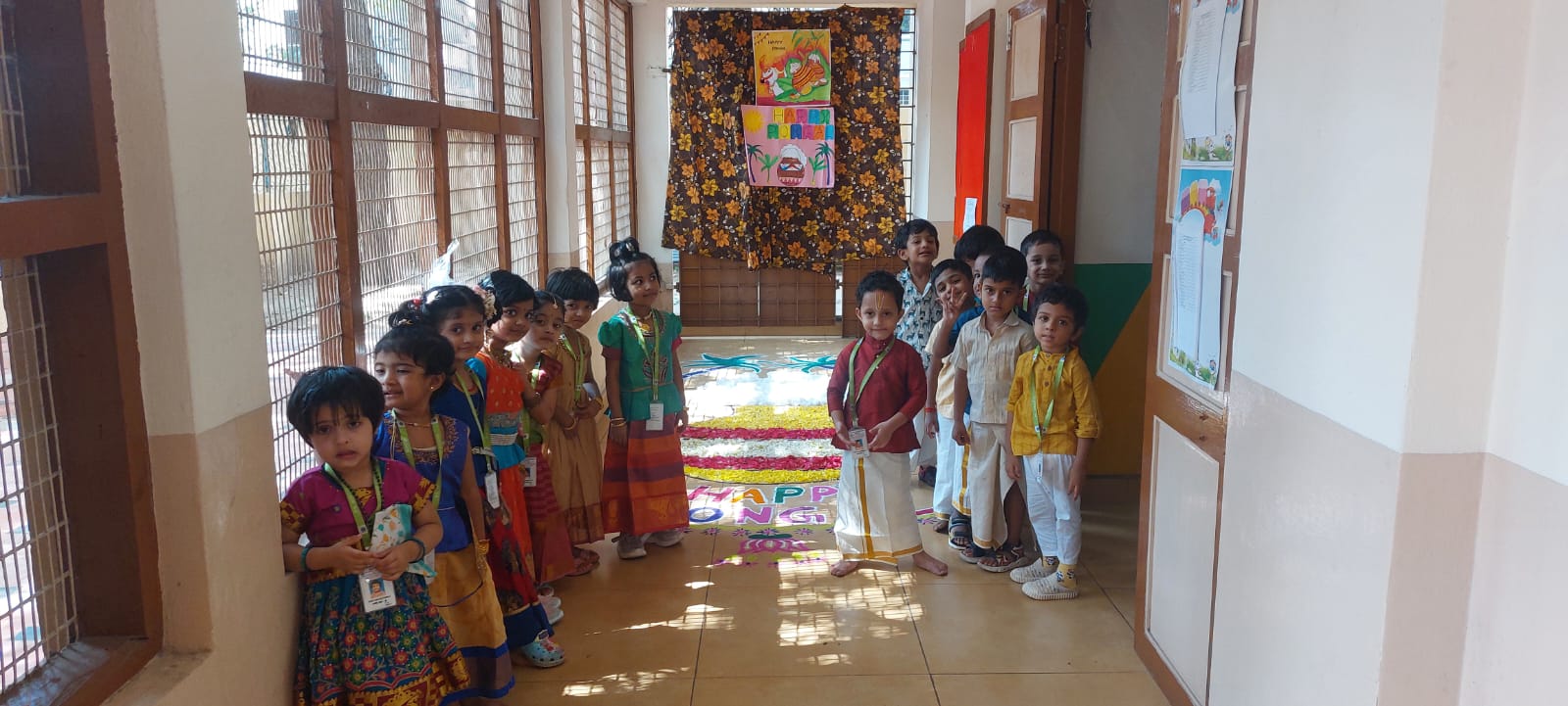 Children brought colourful flowers for making flower rangoli (POOKALAM) which was a collaborative activity by the kg teachers.